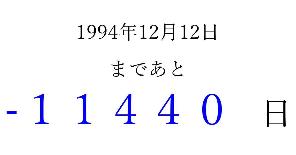 1994年12月12日(月)は もう 00000 日過ぎました 追加すると、トップページからすぐ選べるようになります ※2026/04/08現在の結果です。 最新の状態に更新する ↓シェアして、タイムライン上にカウントダウンを表示しよう!↓ 📤 この結果を共有する Tweet シェア Threads Bluesky 別の日付でカウントダウン 1994年12月のカレンダー このページをブックマークに追加すると、いつでもカウントダウンを確認できます。 (PC: Ctrl+D / Mac: ⌘+D) hitome-notes.comでは以下のページも運営しています。 指定日と期間から日付を計算 | ガチャ確率計算・シミュレーション | プライバシー・ポリシー 運営者:Avocado