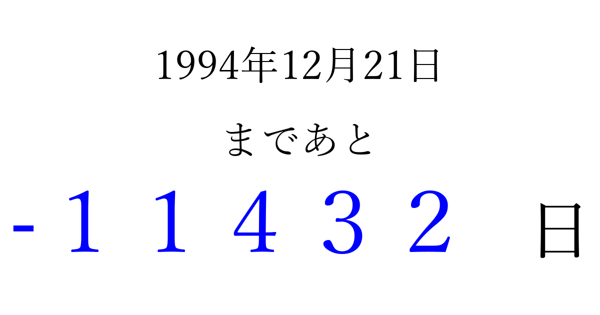 1994年12月21日(水)は もう 00000 日過ぎました 追加すると、トップページからすぐ選べるようになります ※2026/04/09現在の結果です。 最新の状態に更新する ↓シェアして、タイムライン上にカウントダウンを表示しよう!↓ 📤 この結果を共有する Tweet シェア Threads Bluesky 別の日付でカウントダウン 1994年12月のカレンダー このページをブックマークに追加すると、いつでもカウントダウンを確認できます。 (PC: Ctrl+D / Mac: ⌘+D) hitome-notes.comでは以下のページも運営しています。 指定日と期間から日付を計算 | ガチャ確率計算・シミュレーション | プライバシー・ポリシー 運営者:Avocado