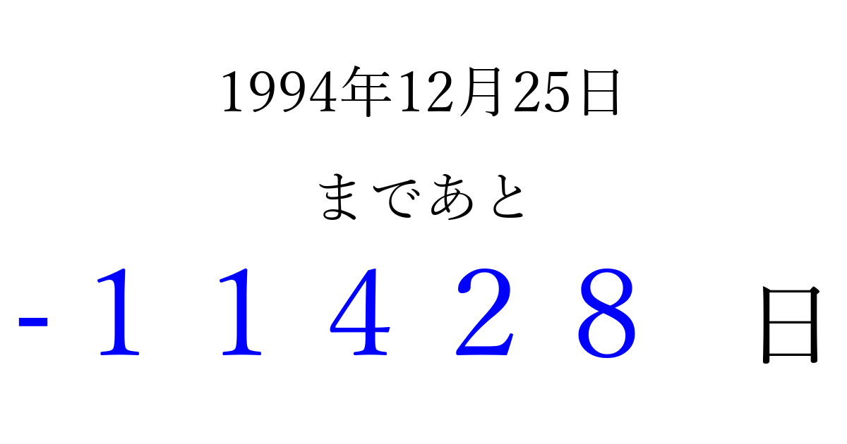 1994年12月25日(日)は もう 00000 日過ぎました 追加すると、トップページからすぐ選べるようになります ※2026/04/09現在の結果です。 最新の状態に更新する ↓シェアして、タイムライン上にカウントダウンを表示しよう!↓ 📤 この結果を共有する Tweet シェア Threads Bluesky 別の日付でカウントダウン 1994年12月のカレンダー このページをブックマークに追加すると、いつでもカウントダウンを確認できます。 (PC: Ctrl+D / Mac: ⌘+D) hitome-notes.comでは以下のページも運営しています。 指定日と期間から日付を計算 | ガチャ確率計算・シミュレーション | プライバシー・ポリシー 運営者:Avocado