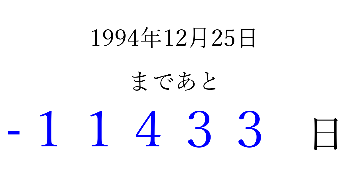 1994年12月25日(日)は もう 00000 日過ぎました 追加すると、トップページからすぐ選べるようになります ※2026/04/14現在の結果です。 最新の状態に更新する ↓シェアして、タイムライン上にカウントダウンを表示しよう!↓ 📤 この結果を共有する Tweet シェア Threads Bluesky 別の日付でカウントダウン 1994年12月のカレンダー このページをブックマークに追加すると、いつでもカウントダウンを確認できます。 (PC: Ctrl+D / Mac: ⌘+D) hitome-notes.comでは以下のページも運営しています。 指定日と期間から日付を計算 | ガチャ確率計算・シミュレーション | プライバシー・ポリシー 運営者:Avocado