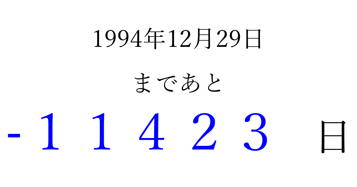 1994年12月29日(木)は もう 00000 日過ぎました 追加すると、トップページからすぐ選べるようになります ※2026/04/08現在の結果です。 最新の状態に更新する ↓シェアして、タイムライン上にカウントダウンを表示しよう!↓ 📤 この結果を共有する Tweet シェア Threads Bluesky 別の日付でカウントダウン 1994年12月のカレンダー このページをブックマークに追加すると、いつでもカウントダウンを確認できます。 (PC: Ctrl+D / Mac: ⌘+D) hitome-notes.comでは以下のページも運営しています。 指定日と期間から日付を計算 | ガチャ確率計算・シミュレーション | プライバシー・ポリシー 運営者:Avocado