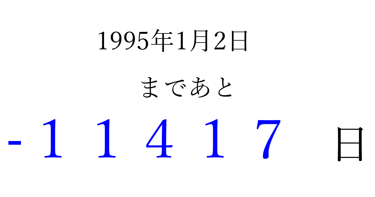 1995年1月2日(月)は もう 00000 日過ぎました 追加すると、トップページからすぐ選べるようになります ※2026/04/06現在の結果です。 最新の状態に更新する ↓シェアして、タイムライン上にカウントダウンを表示しよう!↓ 📤 この結果を共有する Tweet シェア Threads Bluesky 別の日付でカウントダウン 1995年1月のカレンダー このページをブックマークに追加すると、いつでもカウントダウンを確認できます。 (PC: Ctrl+D / Mac: ⌘+D) hitome-notes.comでは以下のページも運営しています。 指定日と期間から日付を計算 | ガチャ確率計算・シミュレーション | プライバシー・ポリシー 運営者:Avocado