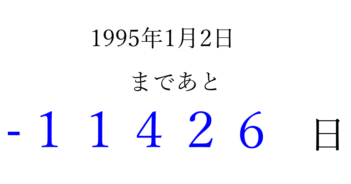 1995年1月2日(月)は もう 00000 日過ぎました 追加すると、トップページからすぐ選べるようになります ※2026/04/15現在の結果です。 最新の状態に更新する ↓シェアして、タイムライン上にカウントダウンを表示しよう!↓ 📤 この結果を共有する Tweet シェア Threads Bluesky 別の日付でカウントダウン 1995年1月のカレンダー このページをブックマークに追加すると、いつでもカウントダウンを確認できます。 (PC: Ctrl+D / Mac: ⌘+D) hitome-notes.comでは以下のページも運営しています。 指定日と期間から日付を計算 | ガチャ確率計算・シミュレーション | プライバシー・ポリシー 運営者:Avocado