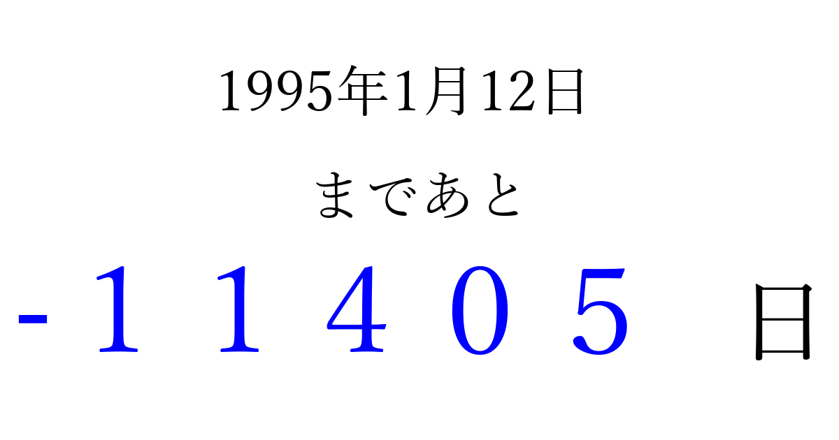 1995年1月12日(木)は もう 00000 日過ぎました 追加すると、トップページからすぐ選べるようになります ※2026/04/04現在の結果です。 最新の状態に更新する ↓シェアして、タイムライン上にカウントダウンを表示しよう!↓ 📤 この結果を共有する Tweet シェア Threads Bluesky 別の日付でカウントダウン 1995年1月のカレンダー このページをブックマークに追加すると、いつでもカウントダウンを確認できます。 (PC: Ctrl+D / Mac: ⌘+D) hitome-notes.comでは以下のページも運営しています。 指定日と期間から日付を計算 | ガチャ確率計算・シミュレーション | プライバシー・ポリシー 運営者:Avocado