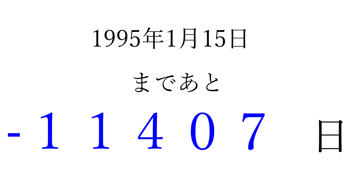 1995年1月15日(日)は もう 00000 日過ぎました 追加すると、トップページからすぐ選べるようになります ※2026/04/09現在の結果です。 最新の状態に更新する ↓シェアして、タイムライン上にカウントダウンを表示しよう!↓ 📤 この結果を共有する Tweet シェア Threads Bluesky 別の日付でカウントダウン 1995年1月のカレンダー このページをブックマークに追加すると、いつでもカウントダウンを確認できます。 (PC: Ctrl+D / Mac: ⌘+D) hitome-notes.comでは以下のページも運営しています。 指定日と期間から日付を計算 | ガチャ確率計算・シミュレーション | プライバシー・ポリシー 運営者:Avocado