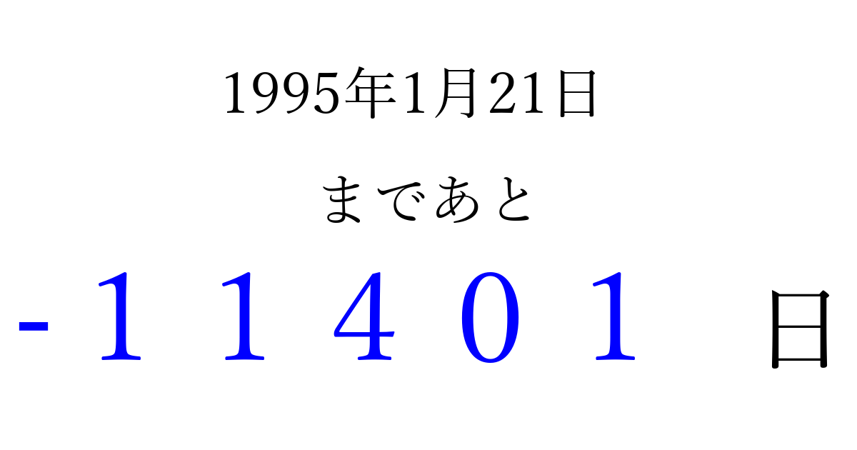 1995年1月21日(土)は もう 00000 日過ぎました 追加すると、トップページからすぐ選べるようになります ※2026/04/09現在の結果です。 最新の状態に更新する ↓シェアして、タイムライン上にカウントダウンを表示しよう!↓ 📤 この結果を共有する Tweet シェア Threads Bluesky 別の日付でカウントダウン 1995年1月のカレンダー このページをブックマークに追加すると、いつでもカウントダウンを確認できます。 (PC: Ctrl+D / Mac: ⌘+D) hitome-notes.comでは以下のページも運営しています。 指定日と期間から日付を計算 | ガチャ確率計算・シミュレーション | プライバシー・ポリシー 運営者:Avocado