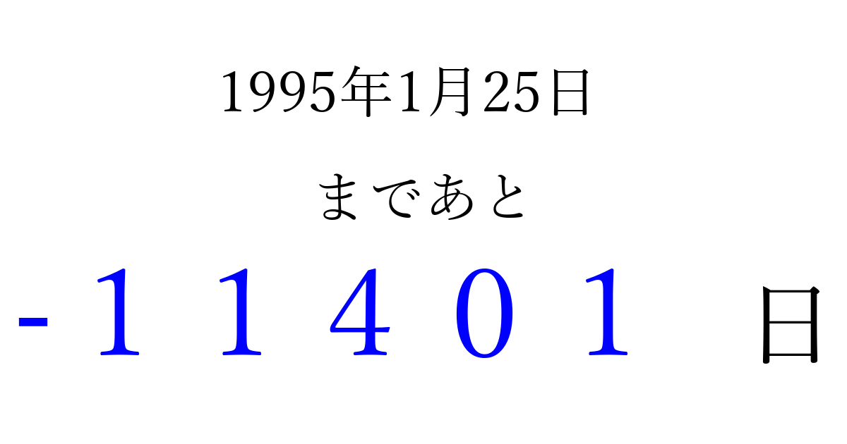 1995年1月25日(水)は もう 00000 日過ぎました 追加すると、トップページからすぐ選べるようになります ※2026/04/13現在の結果です。 最新の状態に更新する ↓シェアして、タイムライン上にカウントダウンを表示しよう!↓ 📤 この結果を共有する Tweet シェア Threads Bluesky 別の日付でカウントダウン 1995年1月のカレンダー このページをブックマークに追加すると、いつでもカウントダウンを確認できます。 (PC: Ctrl+D / Mac: ⌘+D) hitome-notes.comでは以下のページも運営しています。 指定日と期間から日付を計算 | ガチャ確率計算・シミュレーション | プライバシー・ポリシー 運営者:Avocado