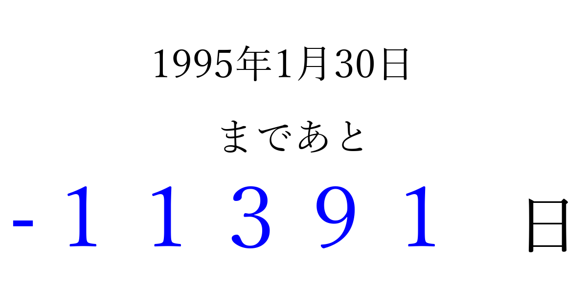 1995年1月30日(月)は もう 00000 日過ぎました 追加すると、トップページからすぐ選べるようになります ※2026/04/08現在の結果です。 最新の状態に更新する ↓シェアして、タイムライン上にカウントダウンを表示しよう!↓ 📤 この結果を共有する Tweet シェア Threads Bluesky 別の日付でカウントダウン 1995年1月のカレンダー このページをブックマークに追加すると、いつでもカウントダウンを確認できます。 (PC: Ctrl+D / Mac: ⌘+D) hitome-notes.comでは以下のページも運営しています。 指定日と期間から日付を計算 | ガチャ確率計算・シミュレーション | プライバシー・ポリシー 運営者:Avocado