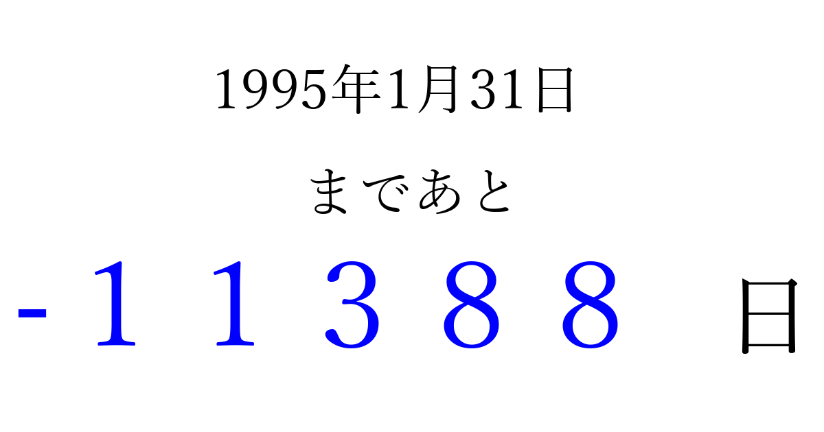 1995年1月31日(火)は もう 00000 日過ぎました 追加すると、トップページからすぐ選べるようになります ※2026/04/06現在の結果です。 最新の状態に更新する ↓シェアして、タイムライン上にカウントダウンを表示しよう!↓ 📤 この結果を共有する Tweet シェア Threads Bluesky 別の日付でカウントダウン 1995年1月のカレンダー このページをブックマークに追加すると、いつでもカウントダウンを確認できます。 (PC: Ctrl+D / Mac: ⌘+D) hitome-notes.comでは以下のページも運営しています。 指定日と期間から日付を計算 | ガチャ確率計算・シミュレーション | プライバシー・ポリシー 運営者:Avocado