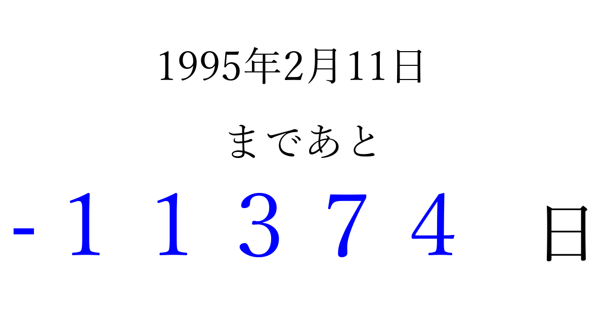 1995年2月11日(土)は もう 00000 日過ぎました 追加すると、トップページからすぐ選べるようになります ※2026/04/03現在の結果です。 最新の状態に更新する ↓シェアして、タイムライン上にカウントダウンを表示しよう!↓ 📤 この結果を共有する Tweet シェア Threads Bluesky 別の日付でカウントダウン 1995年2月のカレンダー このページをブックマークに追加すると、いつでもカウントダウンを確認できます。 (PC: Ctrl+D / Mac: ⌘+D) hitome-notes.comでは以下のページも運営しています。 指定日と期間から日付を計算 | ガチャ確率計算・シミュレーション | プライバシー・ポリシー 運営者:Avocado
