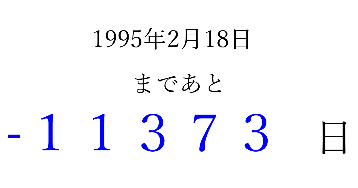 1995年2月18日(土)は もう 00000 日過ぎました 追加すると、トップページからすぐ選べるようになります ※2026/04/09現在の結果です。 最新の状態に更新する ↓シェアして、タイムライン上にカウントダウンを表示しよう!↓ 📤 この結果を共有する Tweet シェア Threads Bluesky 別の日付でカウントダウン 1995年2月のカレンダー このページをブックマークに追加すると、いつでもカウントダウンを確認できます。 (PC: Ctrl+D / Mac: ⌘+D) hitome-notes.comでは以下のページも運営しています。 指定日と期間から日付を計算 | ガチャ確率計算・シミュレーション | プライバシー・ポリシー 運営者:Avocado