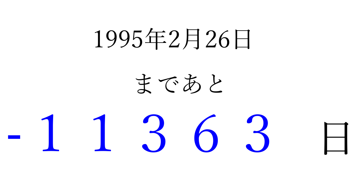 1995年2月26日(日)は もう 00000 日過ぎました 追加すると、トップページからすぐ選べるようになります ※2026/04/07現在の結果です。 最新の状態に更新する ↓シェアして、タイムライン上にカウントダウンを表示しよう!↓ 📤 この結果を共有する Tweet シェア Threads Bluesky 別の日付でカウントダウン 1995年2月のカレンダー このページをブックマークに追加すると、いつでもカウントダウンを確認できます。 (PC: Ctrl+D / Mac: ⌘+D) hitome-notes.comでは以下のページも運営しています。 指定日と期間から日付を計算 | ガチャ確率計算・シミュレーション | プライバシー・ポリシー 運営者:Avocado