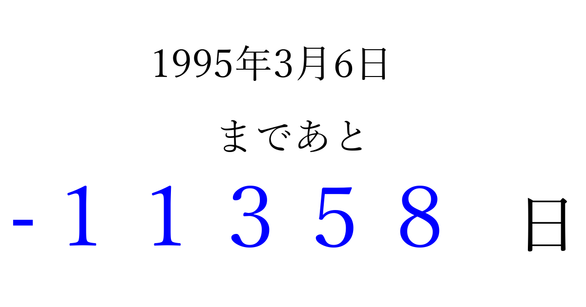 1995年3月6日(月)は もう 00000 日過ぎました 追加すると、トップページからすぐ選べるようになります ※2026/04/10現在の結果です。 最新の状態に更新する ↓シェアして、タイムライン上にカウントダウンを表示しよう!↓ 📤 この結果を共有する Tweet シェア Threads Bluesky 別の日付でカウントダウン 1995年3月のカレンダー このページをブックマークに追加すると、いつでもカウントダウンを確認できます。 (PC: Ctrl+D / Mac: ⌘+D) hitome-notes.comでは以下のページも運営しています。 指定日と期間から日付を計算 | ガチャ確率計算・シミュレーション | プライバシー・ポリシー 運営者:Avocado
