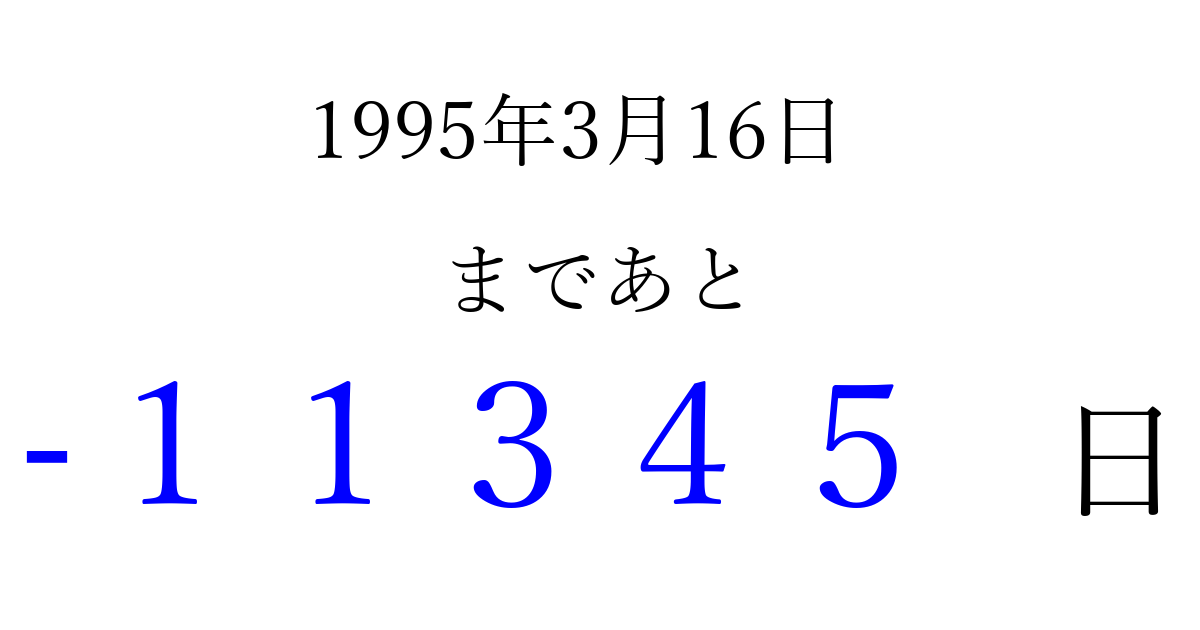 1995年3月16日(木)は もう 00000 日過ぎました 追加すると、トップページからすぐ選べるようになります ※2026/04/07現在の結果です。 最新の状態に更新する ↓シェアして、タイムライン上にカウントダウンを表示しよう!↓ 📤 この結果を共有する Tweet シェア Threads Bluesky 別の日付でカウントダウン 1995年3月のカレンダー このページをブックマークに追加すると、いつでもカウントダウンを確認できます。 (PC: Ctrl+D / Mac: ⌘+D) hitome-notes.comでは以下のページも運営しています。 指定日と期間から日付を計算 | ガチャ確率計算・シミュレーション | プライバシー・ポリシー 運営者:Avocado