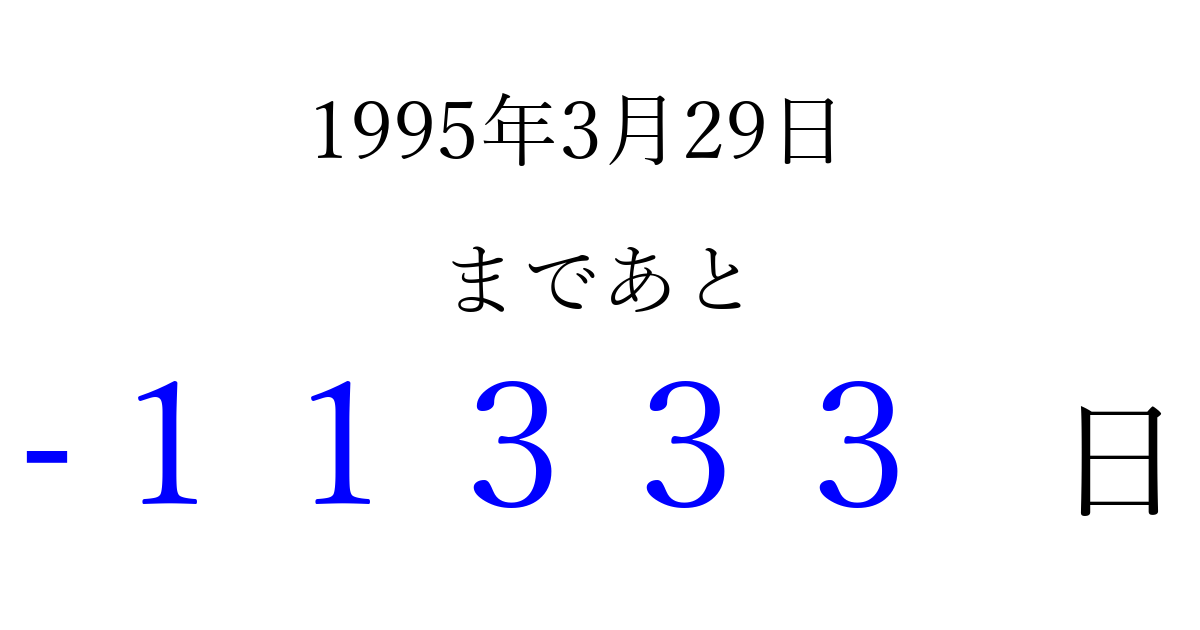 1995年3月29日(水)は もう 00000 日過ぎました 追加すると、トップページからすぐ選べるようになります ※2026/04/08現在の結果です。 最新の状態に更新する ↓シェアして、タイムライン上にカウントダウンを表示しよう!↓ 📤 この結果を共有する Tweet シェア Threads Bluesky 別の日付でカウントダウン 1995年3月のカレンダー このページをブックマークに追加すると、いつでもカウントダウンを確認できます。 (PC: Ctrl+D / Mac: ⌘+D) hitome-notes.comでは以下のページも運営しています。 指定日と期間から日付を計算 | ガチャ確率計算・シミュレーション | プライバシー・ポリシー 運営者:Avocado