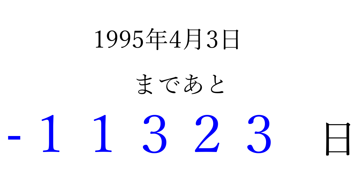 1995年4月3日(月)は もう 00000 日過ぎました 追加すると、トップページからすぐ選べるようになります ※2026/04/03現在の結果です。 最新の状態に更新する ↓シェアして、タイムライン上にカウントダウンを表示しよう!↓ 📤 この結果を共有する Tweet シェア Threads Bluesky 別の日付でカウントダウン 1995年4月のカレンダー このページをブックマークに追加すると、いつでもカウントダウンを確認できます。 (PC: Ctrl+D / Mac: ⌘+D) hitome-notes.comでは以下のページも運営しています。 指定日と期間から日付を計算 | ガチャ確率計算・シミュレーション | プライバシー・ポリシー 運営者:Avocado