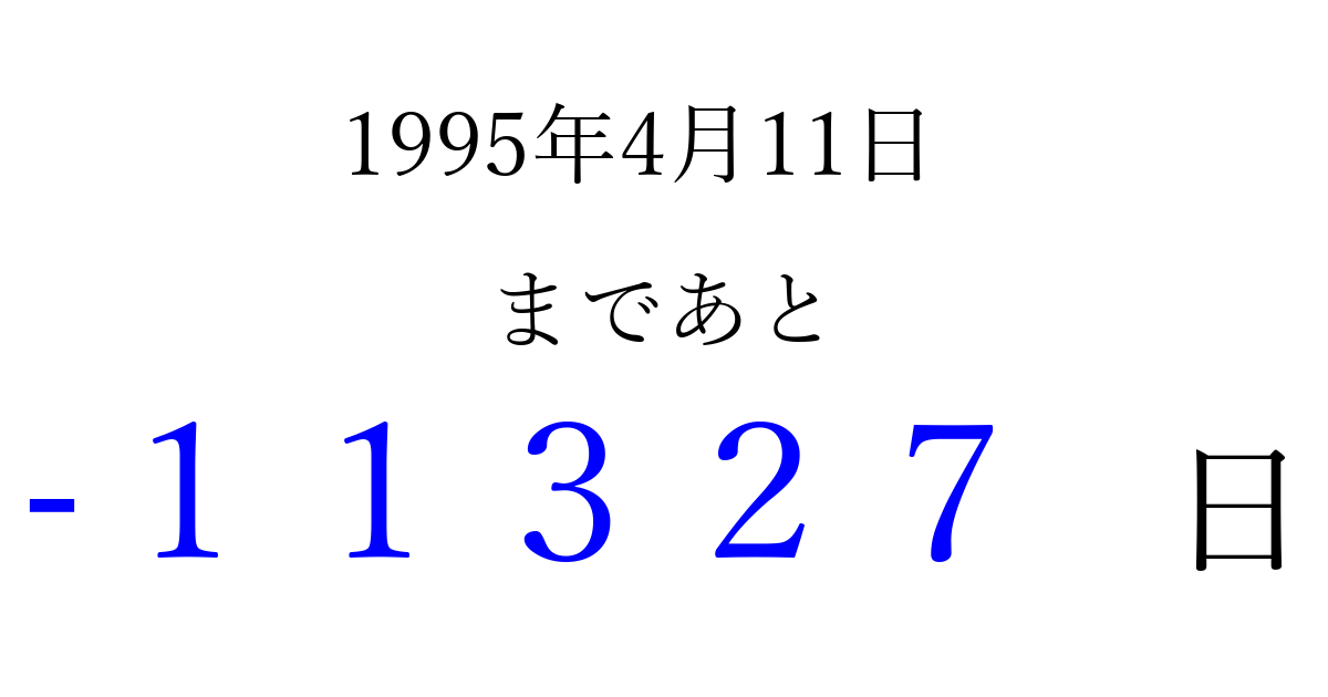1995年4月11日(火)は もう 00000 日過ぎました 追加すると、トップページからすぐ選べるようになります ※2026/04/15現在の結果です。 最新の状態に更新する ↓シェアして、タイムライン上にカウントダウンを表示しよう!↓ 📤 この結果を共有する Tweet シェア Threads Bluesky 別の日付でカウントダウン 1995年4月のカレンダー このページをブックマークに追加すると、いつでもカウントダウンを確認できます。 (PC: Ctrl+D / Mac: ⌘+D) hitome-notes.comでは以下のページも運営しています。 指定日と期間から日付を計算 | ガチャ確率計算・シミュレーション | プライバシー・ポリシー 運営者:Avocado