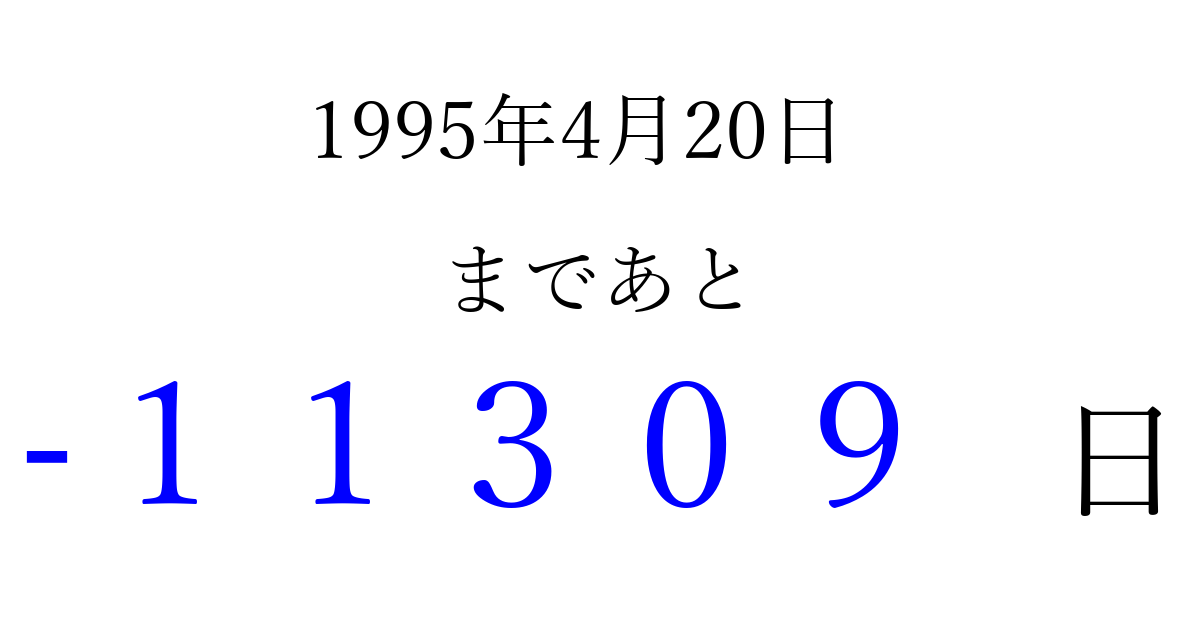 1995年4月20日(木)は もう 00000 日過ぎました 追加すると、トップページからすぐ選べるようになります ※2026/04/06現在の結果です。 最新の状態に更新する ↓シェアして、タイムライン上にカウントダウンを表示しよう!↓ 📤 この結果を共有する Tweet シェア Threads Bluesky 別の日付でカウントダウン 1995年4月のカレンダー このページをブックマークに追加すると、いつでもカウントダウンを確認できます。 (PC: Ctrl+D / Mac: ⌘+D) hitome-notes.comでは以下のページも運営しています。 指定日と期間から日付を計算 | ガチャ確率計算・シミュレーション | プライバシー・ポリシー 運営者:Avocado