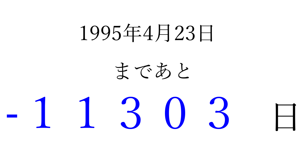 1995年4月23日(日)は もう 00000 日過ぎました 追加すると、トップページからすぐ選べるようになります ※2026/04/03現在の結果です。 最新の状態に更新する ↓シェアして、タイムライン上にカウントダウンを表示しよう!↓ 📤 この結果を共有する Tweet シェア Threads Bluesky 別の日付でカウントダウン 1995年4月のカレンダー このページをブックマークに追加すると、いつでもカウントダウンを確認できます。 (PC: Ctrl+D / Mac: ⌘+D) hitome-notes.comでは以下のページも運営しています。 指定日と期間から日付を計算 | ガチャ確率計算・シミュレーション | プライバシー・ポリシー 運営者:Avocado
