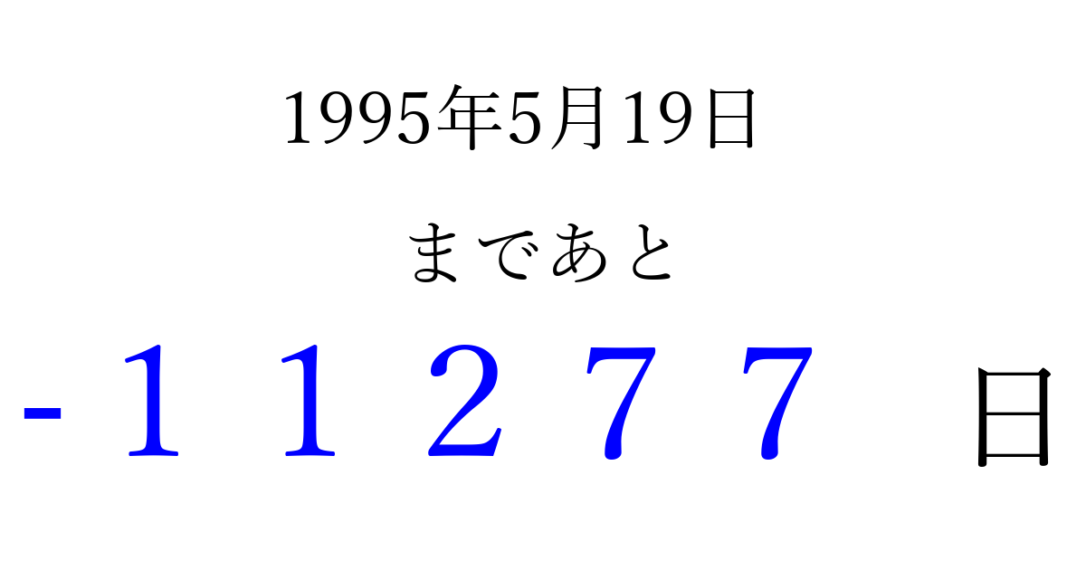 1995年5月19日(金)は もう 00000 日過ぎました 追加すると、トップページからすぐ選べるようになります ※2026/04/03現在の結果です。 最新の状態に更新する ↓シェアして、タイムライン上にカウントダウンを表示しよう!↓ 📤 この結果を共有する Tweet シェア Threads Bluesky 別の日付でカウントダウン 1995年5月のカレンダー このページをブックマークに追加すると、いつでもカウントダウンを確認できます。 (PC: Ctrl+D / Mac: ⌘+D) hitome-notes.comでは以下のページも運営しています。 指定日と期間から日付を計算 | ガチャ確率計算・シミュレーション | プライバシー・ポリシー 運営者:Avocado