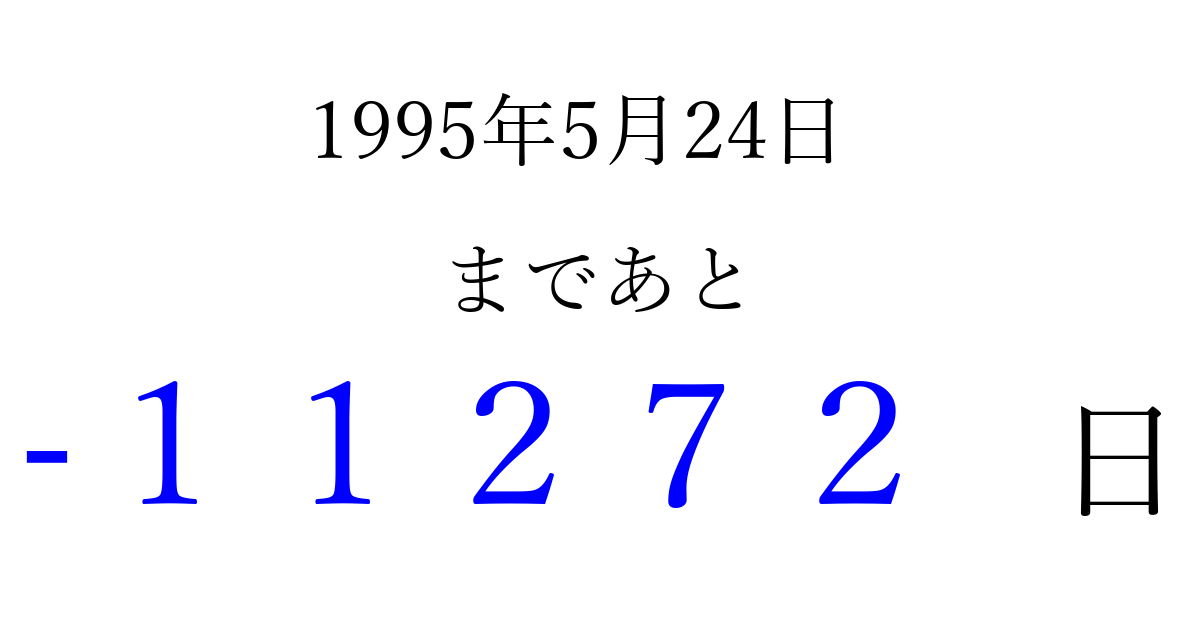 1995年5月24日(水)は もう 00000 日過ぎました 追加すると、トップページからすぐ選べるようになります ※2026/04/03現在の結果です。 最新の状態に更新する ↓シェアして、タイムライン上にカウントダウンを表示しよう!↓ 📤 この結果を共有する Tweet シェア Threads Bluesky 別の日付でカウントダウン 1995年5月のカレンダー このページをブックマークに追加すると、いつでもカウントダウンを確認できます。 (PC: Ctrl+D / Mac: ⌘+D) hitome-notes.comでは以下のページも運営しています。 指定日と期間から日付を計算 | ガチャ確率計算・シミュレーション | プライバシー・ポリシー 運営者:Avocado