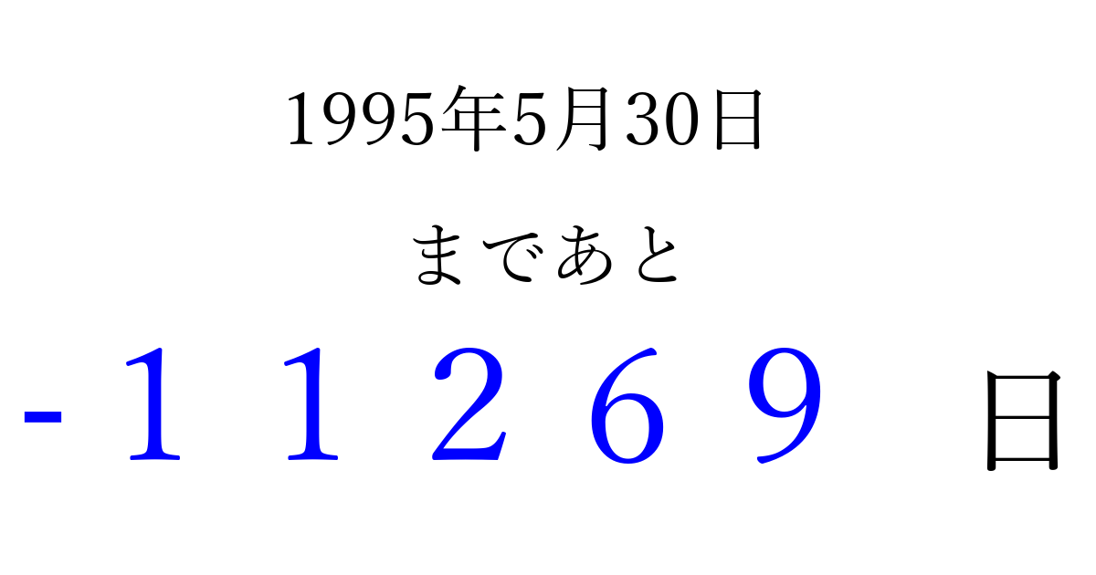 1995年5月30日(火)は もう 00000 日過ぎました 追加すると、トップページからすぐ選べるようになります ※2026/04/06現在の結果です。 最新の状態に更新する ↓シェアして、タイムライン上にカウントダウンを表示しよう!↓ 📤 この結果を共有する Tweet シェア Threads Bluesky 別の日付でカウントダウン 1995年5月のカレンダー このページをブックマークに追加すると、いつでもカウントダウンを確認できます。 (PC: Ctrl+D / Mac: ⌘+D) hitome-notes.comでは以下のページも運営しています。 指定日と期間から日付を計算 | ガチャ確率計算・シミュレーション | プライバシー・ポリシー 運営者:Avocado
