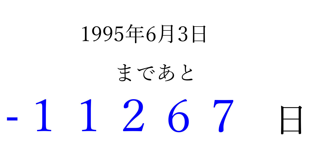 1995年6月3日(土)は もう 00000 日過ぎました 追加すると、トップページからすぐ選べるようになります ※2026/04/08現在の結果です。 最新の状態に更新する ↓シェアして、タイムライン上にカウントダウンを表示しよう!↓ 📤 この結果を共有する Tweet シェア Threads Bluesky 別の日付でカウントダウン 1995年6月のカレンダー このページをブックマークに追加すると、いつでもカウントダウンを確認できます。 (PC: Ctrl+D / Mac: ⌘+D) hitome-notes.comでは以下のページも運営しています。 指定日と期間から日付を計算 | ガチャ確率計算・シミュレーション | プライバシー・ポリシー 運営者:Avocado