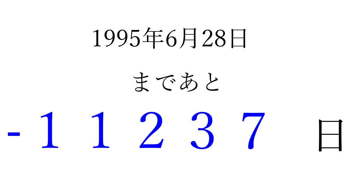 1995年6月28日(水)は もう 00000 日過ぎました 追加すると、トップページからすぐ選べるようになります ※2026/04/03現在の結果です。 最新の状態に更新する ↓シェアして、タイムライン上にカウントダウンを表示しよう!↓ 📤 この結果を共有する Tweet シェア Threads Bluesky 別の日付でカウントダウン 1995年6月のカレンダー このページをブックマークに追加すると、いつでもカウントダウンを確認できます。 (PC: Ctrl+D / Mac: ⌘+D) hitome-notes.comでは以下のページも運営しています。 指定日と期間から日付を計算 | ガチャ確率計算・シミュレーション | プライバシー・ポリシー 運営者:Avocado