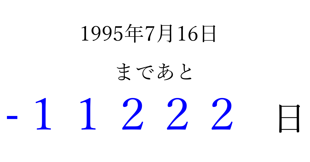 1995年7月16日(日)は もう 00000 日過ぎました 追加すると、トップページからすぐ選べるようになります ※2026/04/06現在の結果です。 最新の状態に更新する ↓シェアして、タイムライン上にカウントダウンを表示しよう!↓ 📤 この結果を共有する Tweet シェア Threads Bluesky 別の日付でカウントダウン 1995年7月のカレンダー このページをブックマークに追加すると、いつでもカウントダウンを確認できます。 (PC: Ctrl+D / Mac: ⌘+D) hitome-notes.comでは以下のページも運営しています。 指定日と期間から日付を計算 | ガチャ確率計算・シミュレーション | プライバシー・ポリシー 運営者:Avocado