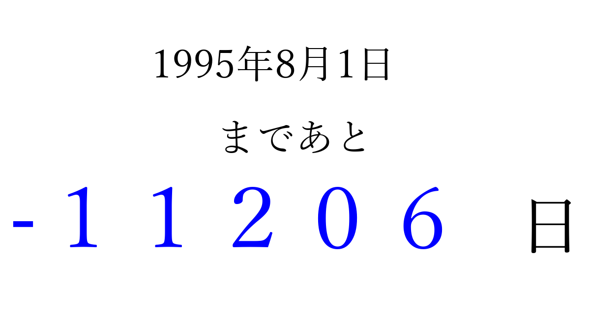 1995年8月1日(火)は もう 00000 日過ぎました 追加すると、トップページからすぐ選べるようになります ※2026/04/06現在の結果です。 最新の状態に更新する ↓シェアして、タイムライン上にカウントダウンを表示しよう!↓ 📤 この結果を共有する Tweet シェア Threads Bluesky 別の日付でカウントダウン 1995年8月のカレンダー このページをブックマークに追加すると、いつでもカウントダウンを確認できます。 (PC: Ctrl+D / Mac: ⌘+D) hitome-notes.comでは以下のページも運営しています。 指定日と期間から日付を計算 | ガチャ確率計算・シミュレーション | プライバシー・ポリシー 運営者:Avocado