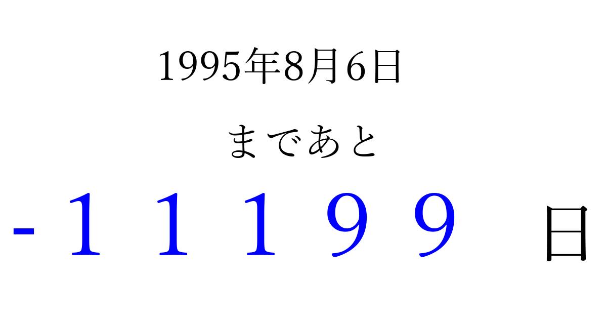 1995年8月6日(日)は もう 00000 日過ぎました 追加すると、トップページからすぐ選べるようになります ※2026/04/04現在の結果です。 最新の状態に更新する ↓シェアして、タイムライン上にカウントダウンを表示しよう!↓ 📤 この結果を共有する Tweet シェア Threads Bluesky 別の日付でカウントダウン 1995年8月のカレンダー このページをブックマークに追加すると、いつでもカウントダウンを確認できます。 (PC: Ctrl+D / Mac: ⌘+D) hitome-notes.comでは以下のページも運営しています。 指定日と期間から日付を計算 | ガチャ確率計算・シミュレーション | プライバシー・ポリシー 運営者:Avocado