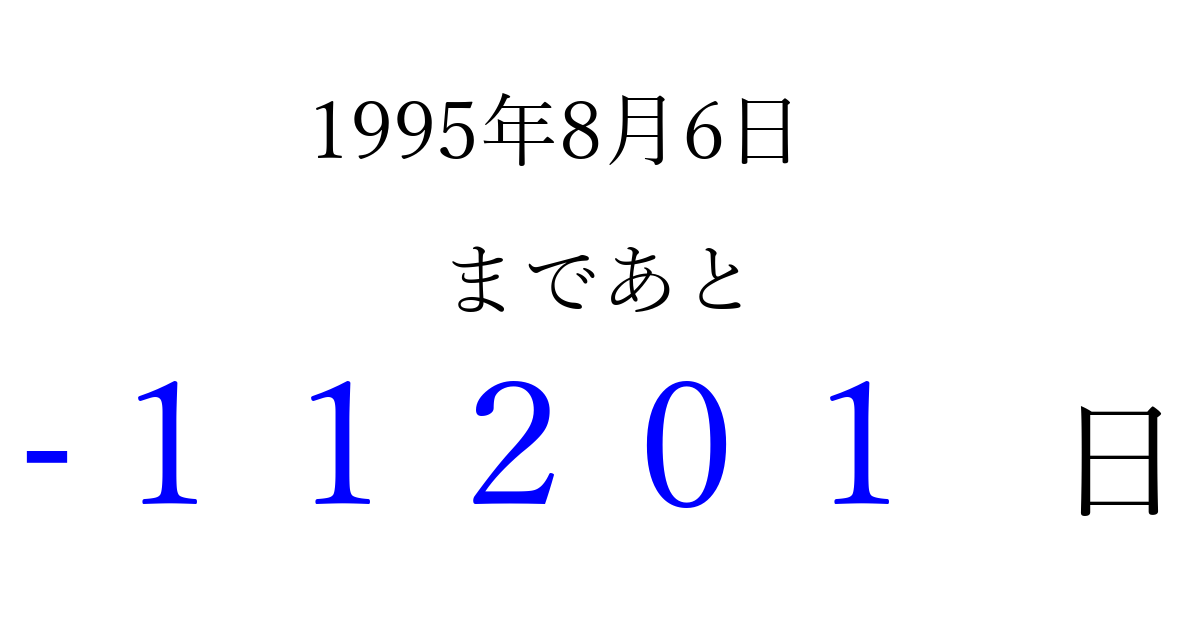 1995年8月6日(日)は もう 00000 日過ぎました 追加すると、トップページからすぐ選べるようになります ※2026/04/06現在の結果です。 最新の状態に更新する ↓シェアして、タイムライン上にカウントダウンを表示しよう!↓ 📤 この結果を共有する Tweet シェア Threads Bluesky 別の日付でカウントダウン 1995年8月のカレンダー このページをブックマークに追加すると、いつでもカウントダウンを確認できます。 (PC: Ctrl+D / Mac: ⌘+D) hitome-notes.comでは以下のページも運営しています。 指定日と期間から日付を計算 | ガチャ確率計算・シミュレーション | プライバシー・ポリシー 運営者:Avocado
