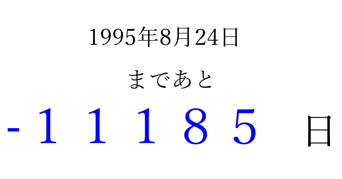 1995年8月24日(木)は もう 00000 日過ぎました 追加すると、トップページからすぐ選べるようになります ※2026/04/08現在の結果です。 最新の状態に更新する ↓シェアして、タイムライン上にカウントダウンを表示しよう!↓ 📤 この結果を共有する Tweet シェア Threads Bluesky 別の日付でカウントダウン 1995年8月のカレンダー このページをブックマークに追加すると、いつでもカウントダウンを確認できます。 (PC: Ctrl+D / Mac: ⌘+D) hitome-notes.comでは以下のページも運営しています。 指定日と期間から日付を計算 | ガチャ確率計算・シミュレーション | プライバシー・ポリシー 運営者:Avocado
