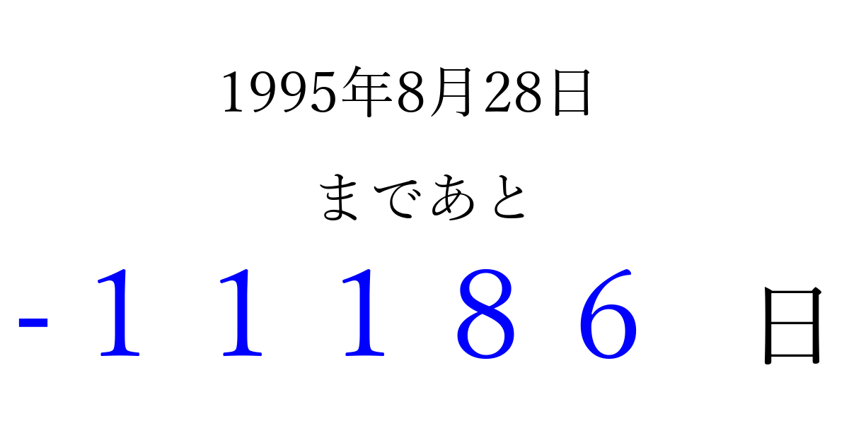 1995年8月28日(月)は もう 00000 日過ぎました 追加すると、トップページからすぐ選べるようになります ※2026/04/13現在の結果です。 最新の状態に更新する ↓シェアして、タイムライン上にカウントダウンを表示しよう!↓ 📤 この結果を共有する Tweet シェア Threads Bluesky 別の日付でカウントダウン 1995年8月のカレンダー このページをブックマークに追加すると、いつでもカウントダウンを確認できます。 (PC: Ctrl+D / Mac: ⌘+D) hitome-notes.comでは以下のページも運営しています。 指定日と期間から日付を計算 | ガチャ確率計算・シミュレーション | プライバシー・ポリシー 運営者:Avocado