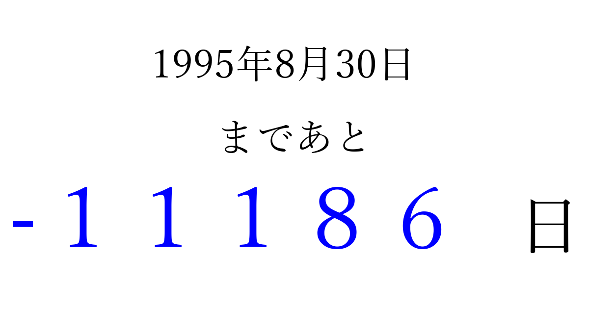 1995年8月30日(水)は もう 00000 日過ぎました 追加すると、トップページからすぐ選べるようになります ※2026/04/15現在の結果です。 最新の状態に更新する ↓シェアして、タイムライン上にカウントダウンを表示しよう!↓ 📤 この結果を共有する Tweet シェア Threads Bluesky 別の日付でカウントダウン 1995年8月のカレンダー このページをブックマークに追加すると、いつでもカウントダウンを確認できます。 (PC: Ctrl+D / Mac: ⌘+D) hitome-notes.comでは以下のページも運営しています。 指定日と期間から日付を計算 | ガチャ確率計算・シミュレーション | プライバシー・ポリシー 運営者:Avocado