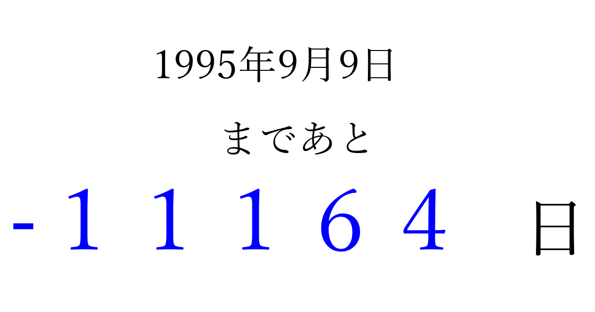 1995年9月9日(土)は もう 00000 日過ぎました 追加すると、トップページからすぐ選べるようになります ※2026/04/03現在の結果です。 最新の状態に更新する ↓シェアして、タイムライン上にカウントダウンを表示しよう!↓ 📤 この結果を共有する Tweet シェア Threads Bluesky 別の日付でカウントダウン 1995年9月のカレンダー このページをブックマークに追加すると、いつでもカウントダウンを確認できます。 (PC: Ctrl+D / Mac: ⌘+D) hitome-notes.comでは以下のページも運営しています。 指定日と期間から日付を計算 | ガチャ確率計算・シミュレーション | プライバシー・ポリシー 運営者:Avocado