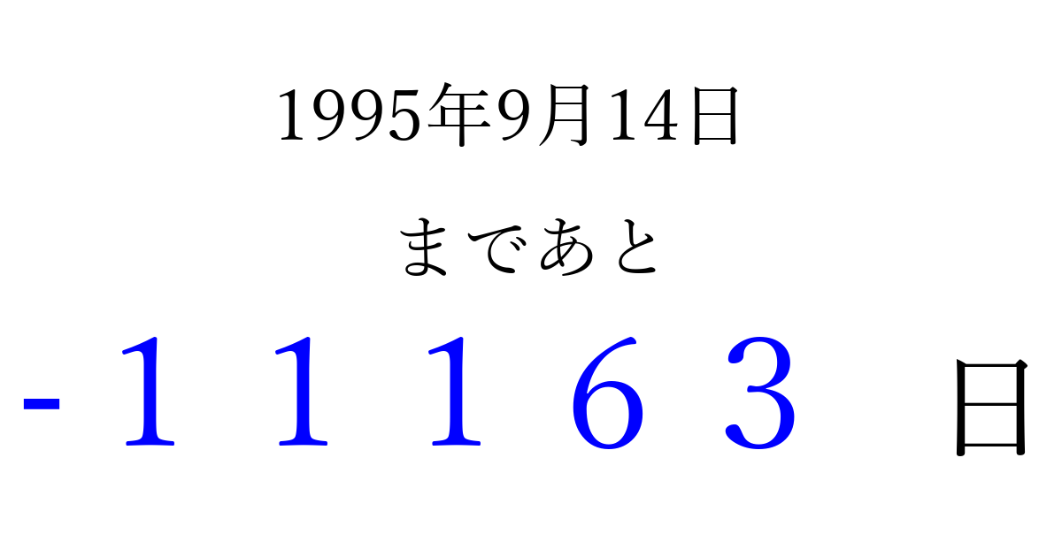 1995年9月14日(木)は もう 00000 日過ぎました 追加すると、トップページからすぐ選べるようになります ※2026/04/07現在の結果です。 最新の状態に更新する ↓シェアして、タイムライン上にカウントダウンを表示しよう!↓ 📤 この結果を共有する Tweet シェア Threads Bluesky 別の日付でカウントダウン 1995年9月のカレンダー このページをブックマークに追加すると、いつでもカウントダウンを確認できます。 (PC: Ctrl+D / Mac: ⌘+D) hitome-notes.comでは以下のページも運営しています。 指定日と期間から日付を計算 | ガチャ確率計算・シミュレーション | プライバシー・ポリシー 運営者:Avocado