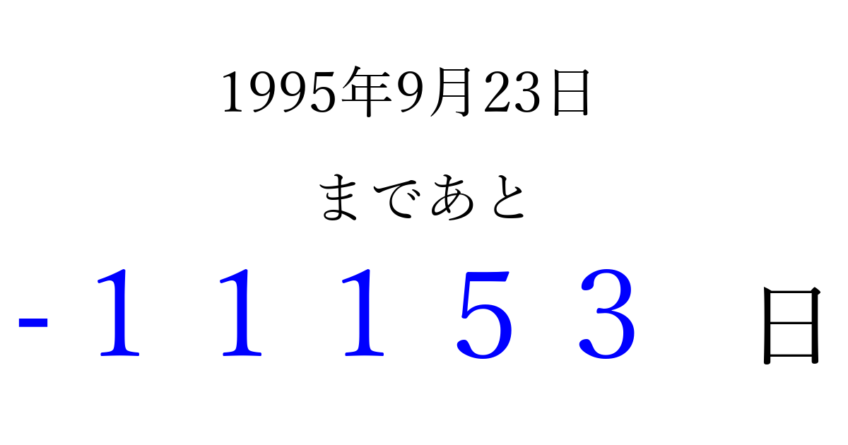 1995年9月23日(土)は もう 00000 日過ぎました 追加すると、トップページからすぐ選べるようになります ※2026/04/06現在の結果です。 最新の状態に更新する ↓シェアして、タイムライン上にカウントダウンを表示しよう!↓ 📤 この結果を共有する Tweet シェア Threads Bluesky 別の日付でカウントダウン 1995年9月のカレンダー このページをブックマークに追加すると、いつでもカウントダウンを確認できます。 (PC: Ctrl+D / Mac: ⌘+D) hitome-notes.comでは以下のページも運営しています。 指定日と期間から日付を計算 | ガチャ確率計算・シミュレーション | プライバシー・ポリシー 運営者:Avocado