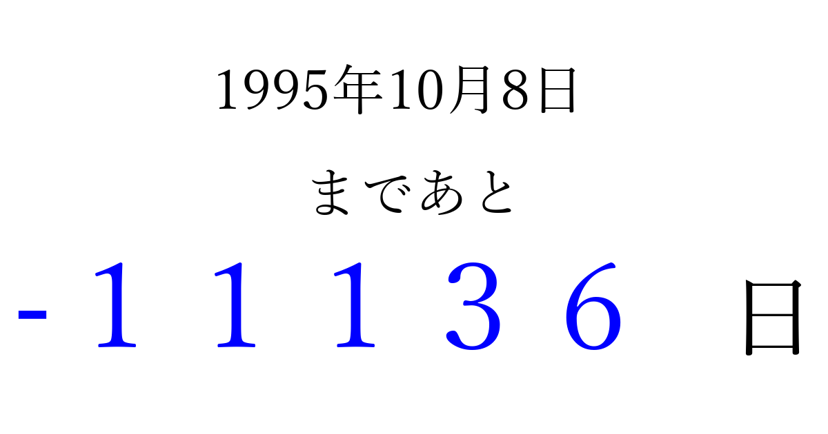 1995年10月8日(日)は もう 00000 日過ぎました 追加すると、トップページからすぐ選べるようになります ※2026/04/04現在の結果です。 最新の状態に更新する ↓シェアして、タイムライン上にカウントダウンを表示しよう!↓ 📤 この結果を共有する Tweet シェア Threads Bluesky 別の日付でカウントダウン 1995年10月のカレンダー このページをブックマークに追加すると、いつでもカウントダウンを確認できます。 (PC: Ctrl+D / Mac: ⌘+D) hitome-notes.comでは以下のページも運営しています。 指定日と期間から日付を計算 | ガチャ確率計算・シミュレーション | プライバシー・ポリシー 運営者:Avocado
