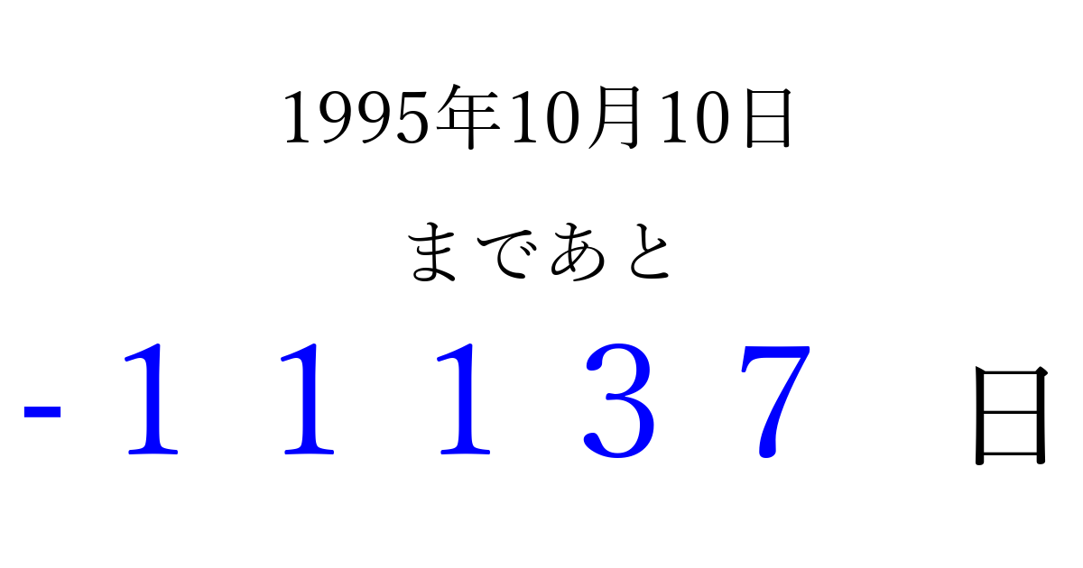 1995年10月10日(火)は もう 00000 日過ぎました 追加すると、トップページからすぐ選べるようになります ※2026/04/07現在の結果です。 最新の状態に更新する ↓シェアして、タイムライン上にカウントダウンを表示しよう!↓ 📤 この結果を共有する Tweet シェア Threads Bluesky 別の日付でカウントダウン 1995年10月のカレンダー このページをブックマークに追加すると、いつでもカウントダウンを確認できます。 (PC: Ctrl+D / Mac: ⌘+D) hitome-notes.comでは以下のページも運営しています。 指定日と期間から日付を計算 | ガチャ確率計算・シミュレーション | プライバシー・ポリシー 運営者:Avocado