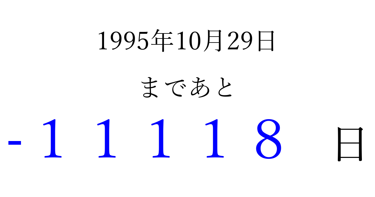 1995年10月29日(日)は もう 00000 日過ぎました 追加すると、トップページからすぐ選べるようになります ※2026/04/07現在の結果です。 最新の状態に更新する ↓シェアして、タイムライン上にカウントダウンを表示しよう!↓ 📤 この結果を共有する Tweet シェア Threads Bluesky 別の日付でカウントダウン 1995年10月のカレンダー このページをブックマークに追加すると、いつでもカウントダウンを確認できます。 (PC: Ctrl+D / Mac: ⌘+D) hitome-notes.comでは以下のページも運営しています。 指定日と期間から日付を計算 | ガチャ確率計算・シミュレーション | プライバシー・ポリシー 運営者:Avocado