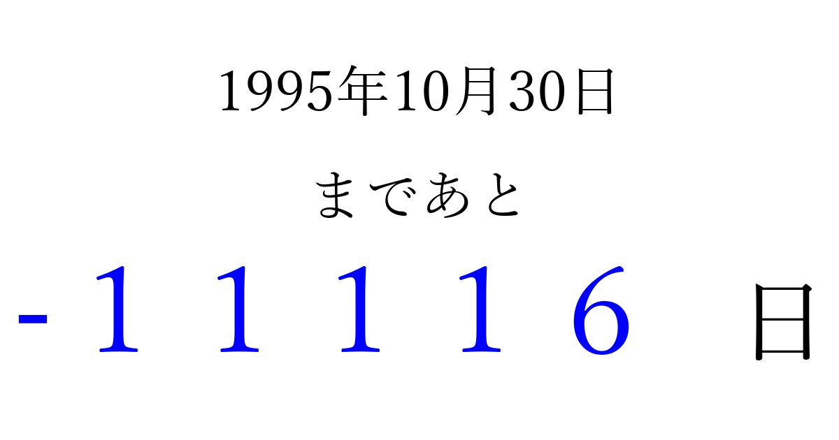 1995年10月30日(月)は もう 00000 日過ぎました 追加すると、トップページからすぐ選べるようになります ※2026/04/06現在の結果です。 最新の状態に更新する ↓シェアして、タイムライン上にカウントダウンを表示しよう!↓ 📤 この結果を共有する Tweet シェア Threads Bluesky 別の日付でカウントダウン 1995年10月のカレンダー このページをブックマークに追加すると、いつでもカウントダウンを確認できます。 (PC: Ctrl+D / Mac: ⌘+D) hitome-notes.comでは以下のページも運営しています。 指定日と期間から日付を計算 | ガチャ確率計算・シミュレーション | プライバシー・ポリシー 運営者:Avocado