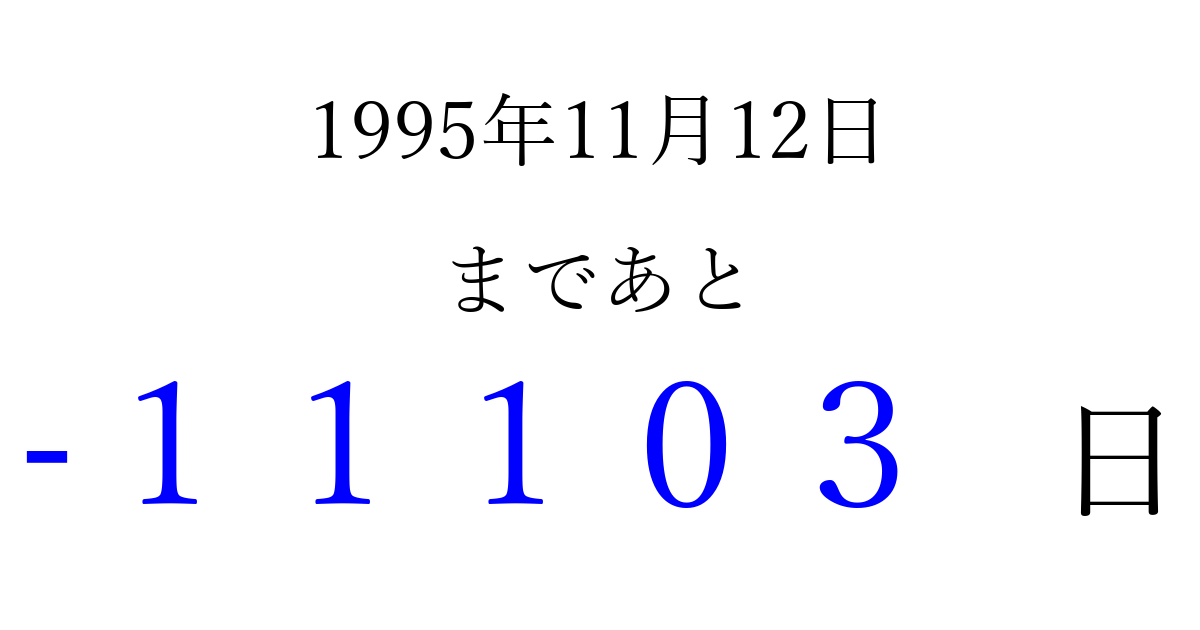 1995年11月12日(日)は もう 00000 日過ぎました 追加すると、トップページからすぐ選べるようになります ※2026/04/06現在の結果です。 最新の状態に更新する ↓シェアして、タイムライン上にカウントダウンを表示しよう!↓ 📤 この結果を共有する Tweet シェア Threads Bluesky 別の日付でカウントダウン 1995年11月のカレンダー このページをブックマークに追加すると、いつでもカウントダウンを確認できます。 (PC: Ctrl+D / Mac: ⌘+D) hitome-notes.comでは以下のページも運営しています。 指定日と期間から日付を計算 | ガチャ確率計算・シミュレーション | プライバシー・ポリシー 運営者:Avocado