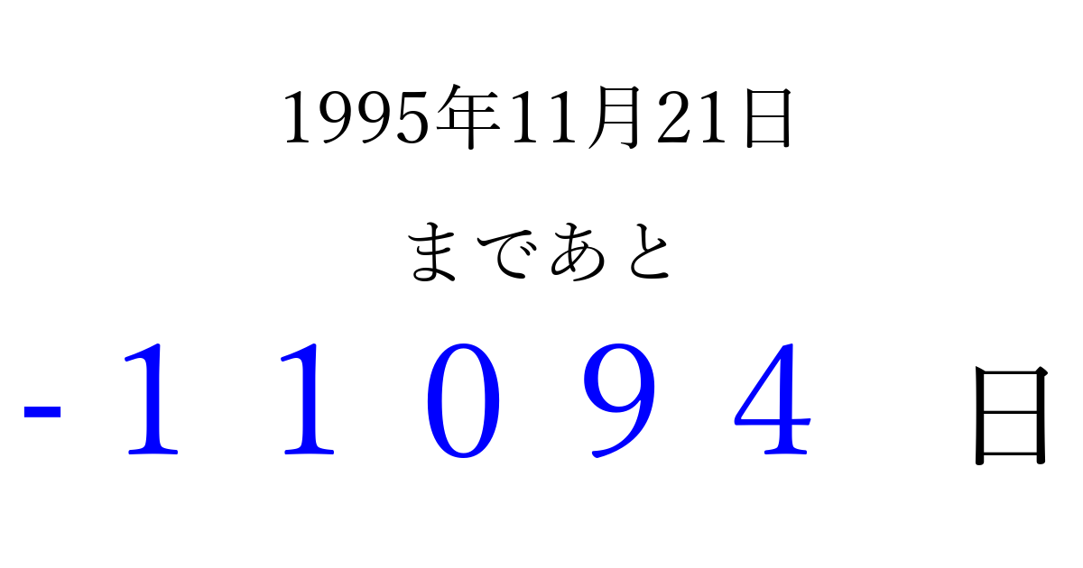 1995年11月21日(火)は もう 00000 日過ぎました 追加すると、トップページからすぐ選べるようになります ※2026/04/06現在の結果です。 最新の状態に更新する ↓シェアして、タイムライン上にカウントダウンを表示しよう!↓ 📤 この結果を共有する Tweet シェア Threads Bluesky 別の日付でカウントダウン 1995年11月のカレンダー このページをブックマークに追加すると、いつでもカウントダウンを確認できます。 (PC: Ctrl+D / Mac: ⌘+D) hitome-notes.comでは以下のページも運営しています。 指定日と期間から日付を計算 | ガチャ確率計算・シミュレーション | プライバシー・ポリシー 運営者:Avocado