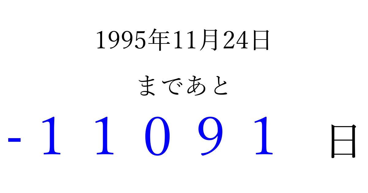 1995年11月24日(金)は もう 00000 日過ぎました 追加すると、トップページからすぐ選べるようになります ※2026/04/06現在の結果です。 最新の状態に更新する ↓シェアして、タイムライン上にカウントダウンを表示しよう!↓ 📤 この結果を共有する Tweet シェア Threads Bluesky 別の日付でカウントダウン 1995年11月のカレンダー このページをブックマークに追加すると、いつでもカウントダウンを確認できます。 (PC: Ctrl+D / Mac: ⌘+D) hitome-notes.comでは以下のページも運営しています。 指定日と期間から日付を計算 | ガチャ確率計算・シミュレーション | プライバシー・ポリシー 運営者:Avocado