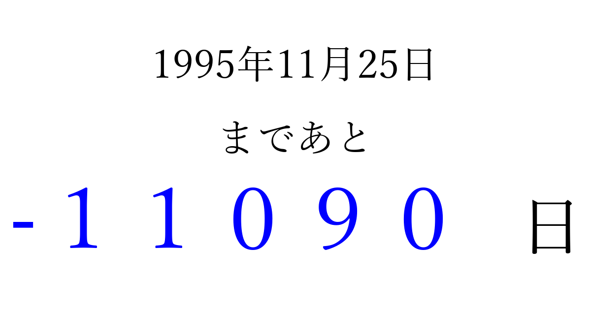 1995年11月25日(土)は もう 00000 日過ぎました 追加すると、トップページからすぐ選べるようになります ※2026/04/06現在の結果です。 最新の状態に更新する ↓シェアして、タイムライン上にカウントダウンを表示しよう!↓ 📤 この結果を共有する Tweet シェア Threads Bluesky 別の日付でカウントダウン 1995年11月のカレンダー このページをブックマークに追加すると、いつでもカウントダウンを確認できます。 (PC: Ctrl+D / Mac: ⌘+D) hitome-notes.comでは以下のページも運営しています。 指定日と期間から日付を計算 | ガチャ確率計算・シミュレーション | プライバシー・ポリシー 運営者:Avocado