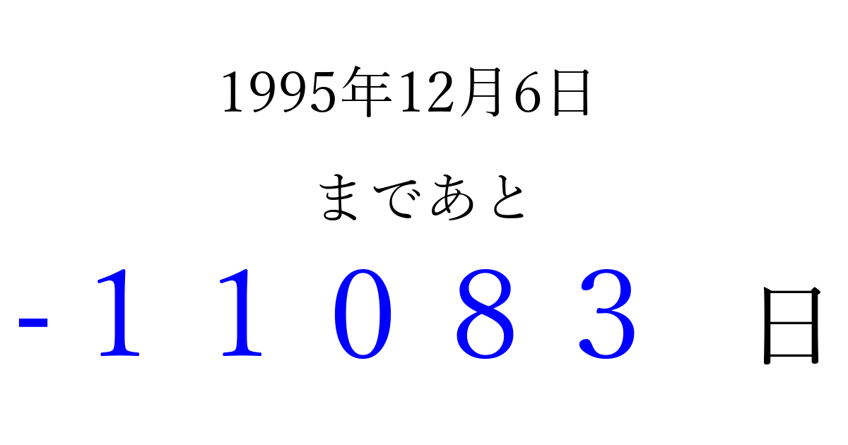1995年12月6日(水)は もう 00000 日過ぎました 追加すると、トップページからすぐ選べるようになります ※2026/04/10現在の結果です。 最新の状態に更新する ↓シェアして、タイムライン上にカウントダウンを表示しよう!↓ 📤 この結果を共有する Tweet シェア Threads Bluesky 別の日付でカウントダウン 1995年12月のカレンダー このページをブックマークに追加すると、いつでもカウントダウンを確認できます。 (PC: Ctrl+D / Mac: ⌘+D) hitome-notes.comでは以下のページも運営しています。 指定日と期間から日付を計算 | ガチャ確率計算・シミュレーション | プライバシー・ポリシー 運営者:Avocado