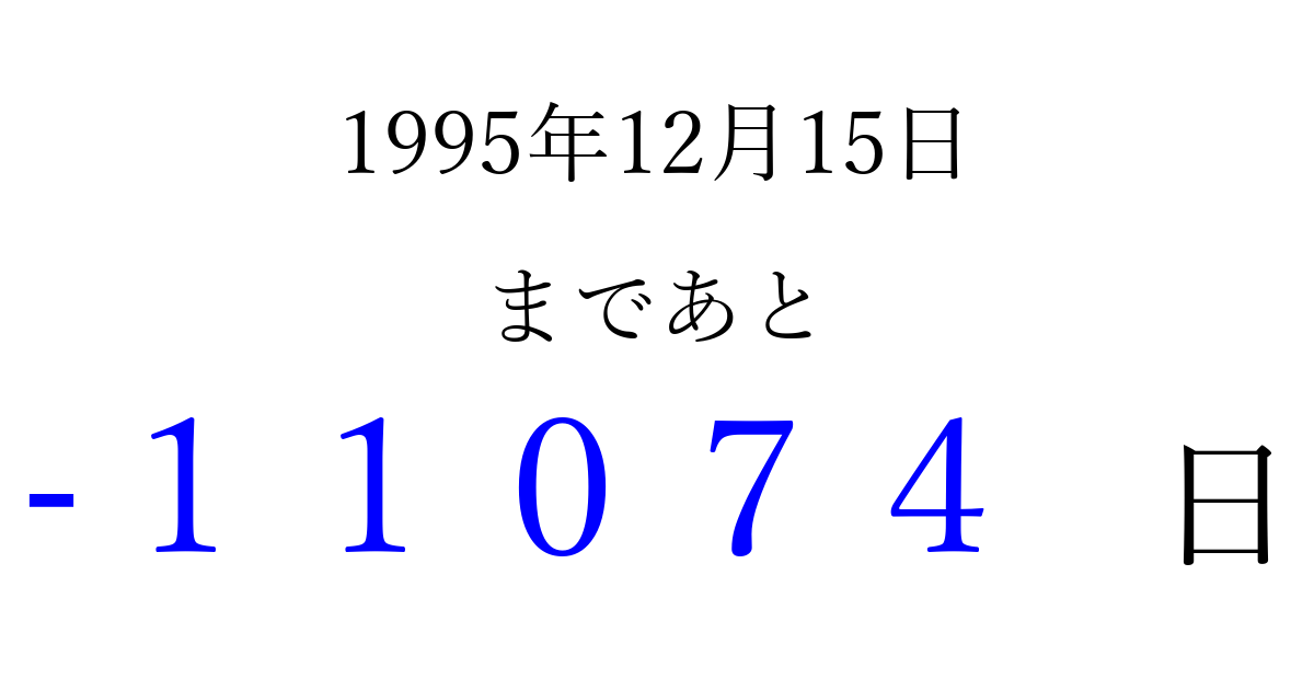 1995年12月15日(金)は もう 00000 日過ぎました 追加すると、トップページからすぐ選べるようになります ※2026/04/10現在の結果です。 最新の状態に更新する ↓シェアして、タイムライン上にカウントダウンを表示しよう!↓ 📤 この結果を共有する Tweet シェア Threads Bluesky 別の日付でカウントダウン 1995年12月のカレンダー このページをブックマークに追加すると、いつでもカウントダウンを確認できます。 (PC: Ctrl+D / Mac: ⌘+D) hitome-notes.comでは以下のページも運営しています。 指定日と期間から日付を計算 | ガチャ確率計算・シミュレーション | プライバシー・ポリシー 運営者:Avocado