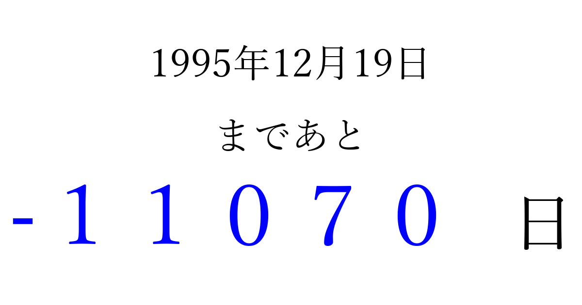 1995年12月19日(火)は もう 00000 日過ぎました 追加すると、トップページからすぐ選べるようになります ※2026/04/10現在の結果です。 最新の状態に更新する ↓シェアして、タイムライン上にカウントダウンを表示しよう!↓ 📤 この結果を共有する Tweet シェア Threads Bluesky 別の日付でカウントダウン 1995年12月のカレンダー このページをブックマークに追加すると、いつでもカウントダウンを確認できます。 (PC: Ctrl+D / Mac: ⌘+D) hitome-notes.comでは以下のページも運営しています。 指定日と期間から日付を計算 | ガチャ確率計算・シミュレーション | プライバシー・ポリシー 運営者:Avocado