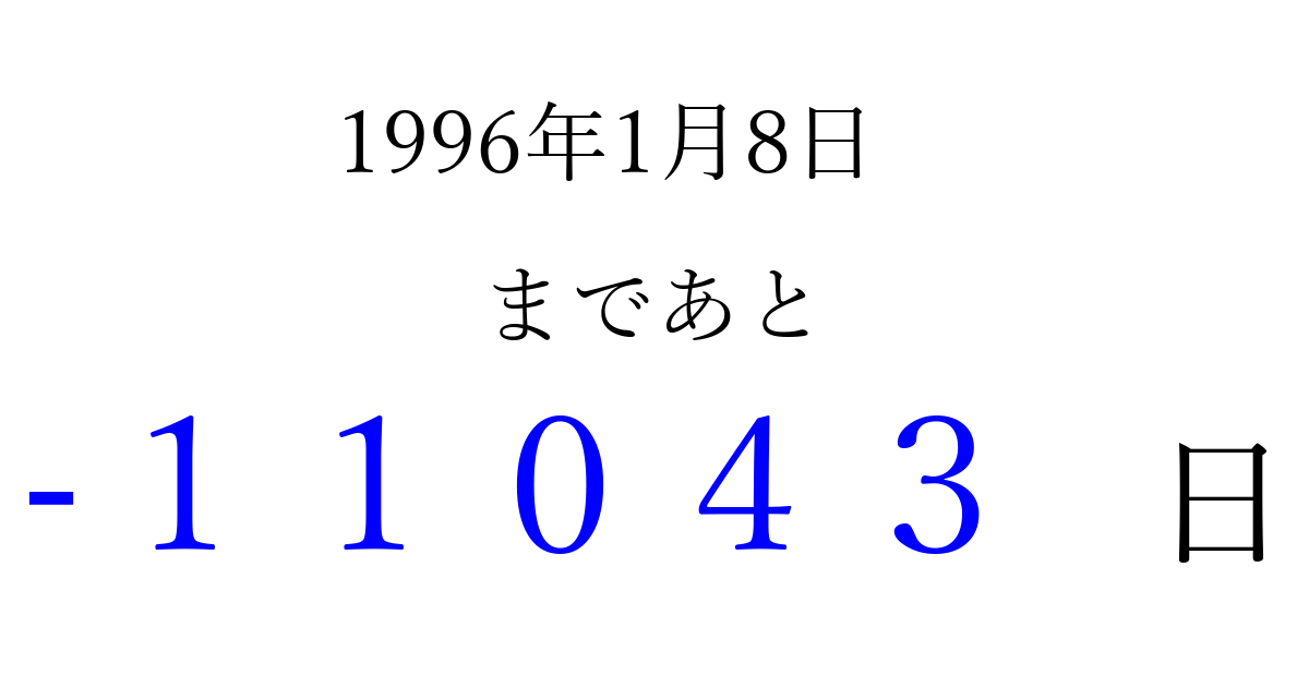 1996年1月8日(月)は もう 00000 日過ぎました 追加すると、トップページからすぐ選べるようになります ※2026/04/03現在の結果です。 最新の状態に更新する ↓シェアして、タイムライン上にカウントダウンを表示しよう!↓ 📤 この結果を共有する Tweet シェア Threads Bluesky 別の日付でカウントダウン 1996年1月のカレンダー このページをブックマークに追加すると、いつでもカウントダウンを確認できます。 (PC: Ctrl+D / Mac: ⌘+D) hitome-notes.comでは以下のページも運営しています。 指定日と期間から日付を計算 | ガチャ確率計算・シミュレーション | プライバシー・ポリシー 運営者:Avocado